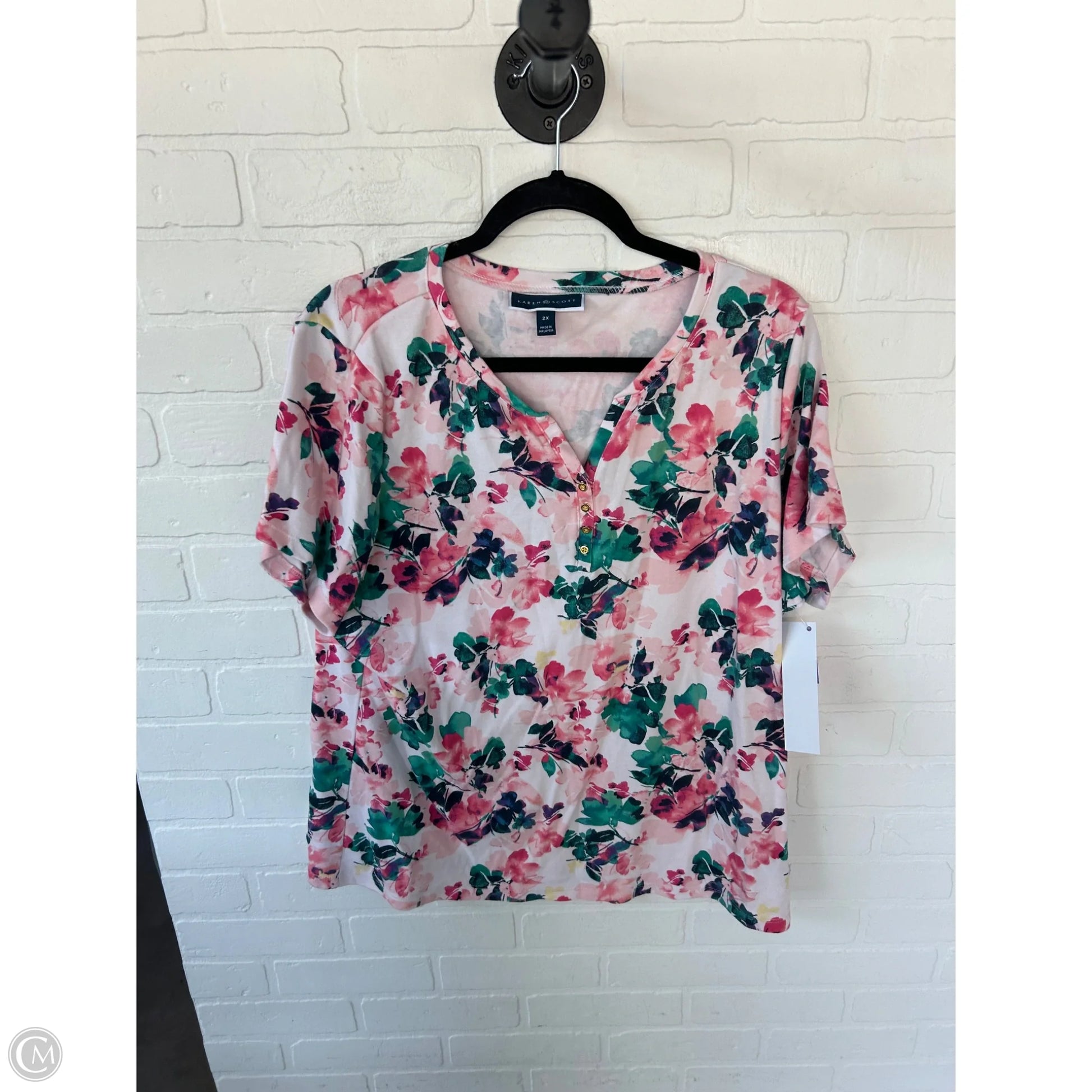Top Short Sleeve By Karen Scott In Green & Pink, Size: 2x